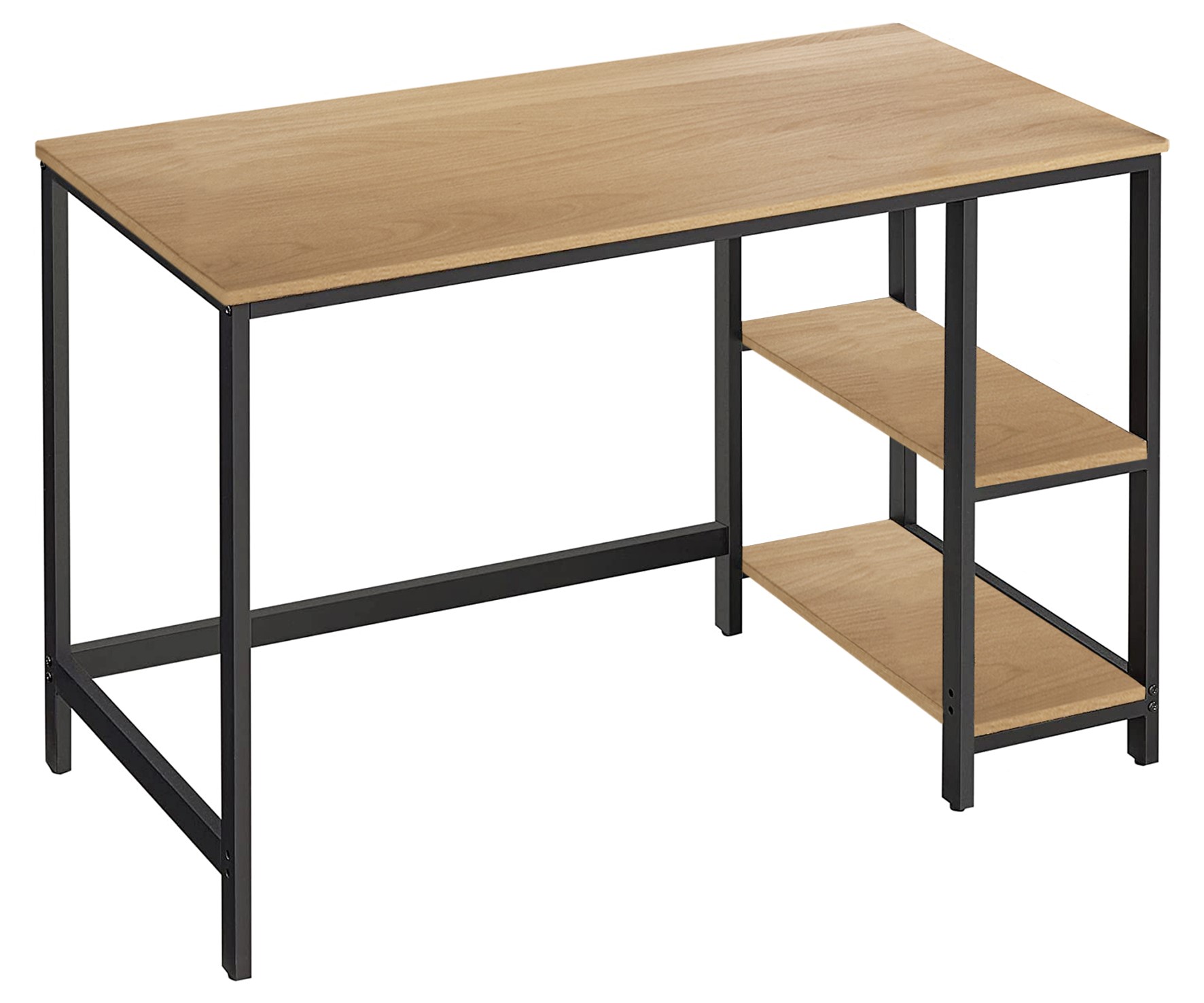 Biurko BERG posiada stelaż metalowy lakierowany proszkowo na kolor czarny. Blat i półki wykonane są z płyty MDF w kolorze dąb.