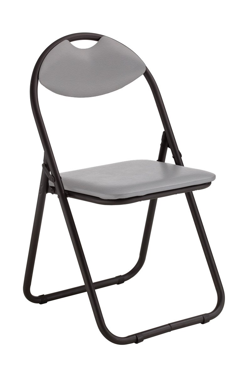 Składane krzesło ATOM posiada ramę stalową lakierowaną na kolor czarny. Siedzisko i oparcie tapicerowane imitacją skóry w szarym kolorze. Stopki nierysujące podłogi. Składane - zajmuje mało miejsca. W oparciu znajduje się uchwyt ułatwiający przenoszenie krzesła. Rama w kształcie litery "U"